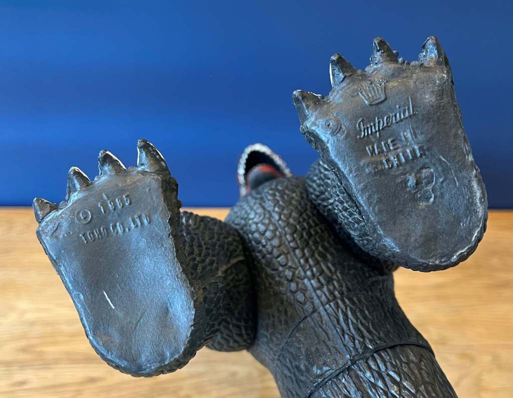 This was the Godzilla which came to be the standard toy of the brand if you grew up in the 1980s outside of Japan. Now the date of the beginning of production is firmly fixed by the ‘1985’ on the foot, however, I cannot believe that the millions of Imperial Godzillas that exist were produced in a single productive run in that year, especially since variants exist with changes to the foot marks noting that production was also carried out in Hong Kong – there producing a slightly smaller version of the large Godzilla (some 12 & 3/8 inches tall, against the full 13 inches as produced in China: see this excellent blog by the Sphinx on these variants, with the same foot-marks, but on reversed feet. As the Sphinx notes, both sizes were reissued by Imperial in 1992 with the same year ‘1985’ and updated paper tags, and it seems likely that production continued for many of the years between 1985 and 1992, with the year given marking Toho’s stamp of authority rather than an accurate date of production.