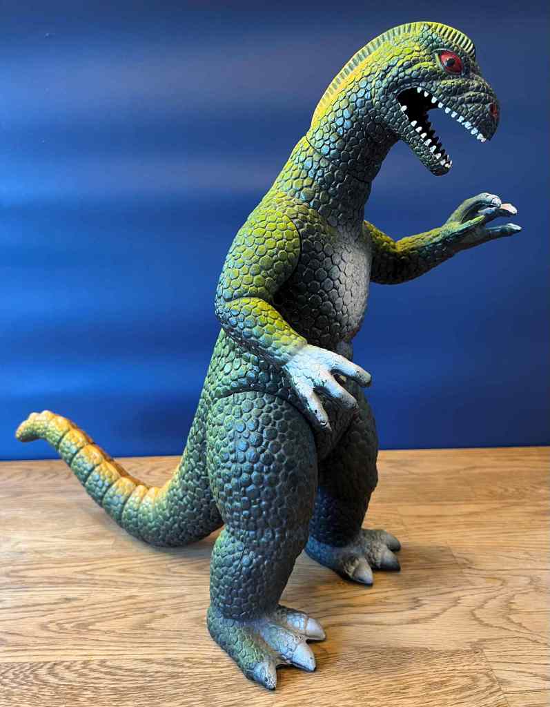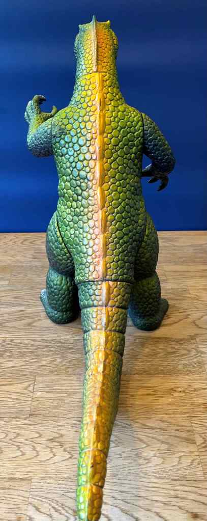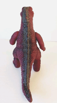 This was made in hard vinyl, stands just under 225mm. high, and weighs 288g. The articulation is the same as the same company’s ‘Godzilla’, but the scales have been remodelled into more realistic overlapping fishscale-like pattern. It has two toes, and shows some signs of residual plastic remaining from the mold-joins, but not as badly as the Imperial models. The throat is closed. They appear in blue edged with yellow-green, burgundy-red edged with green or the quite snazzy red, orange and yellow edged with green. The back fin often is folded over to one side, and this presumably was a common production defect – this is also found with chinasaurs with large dorsal fins.