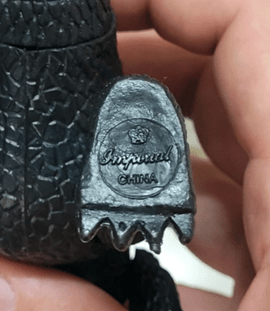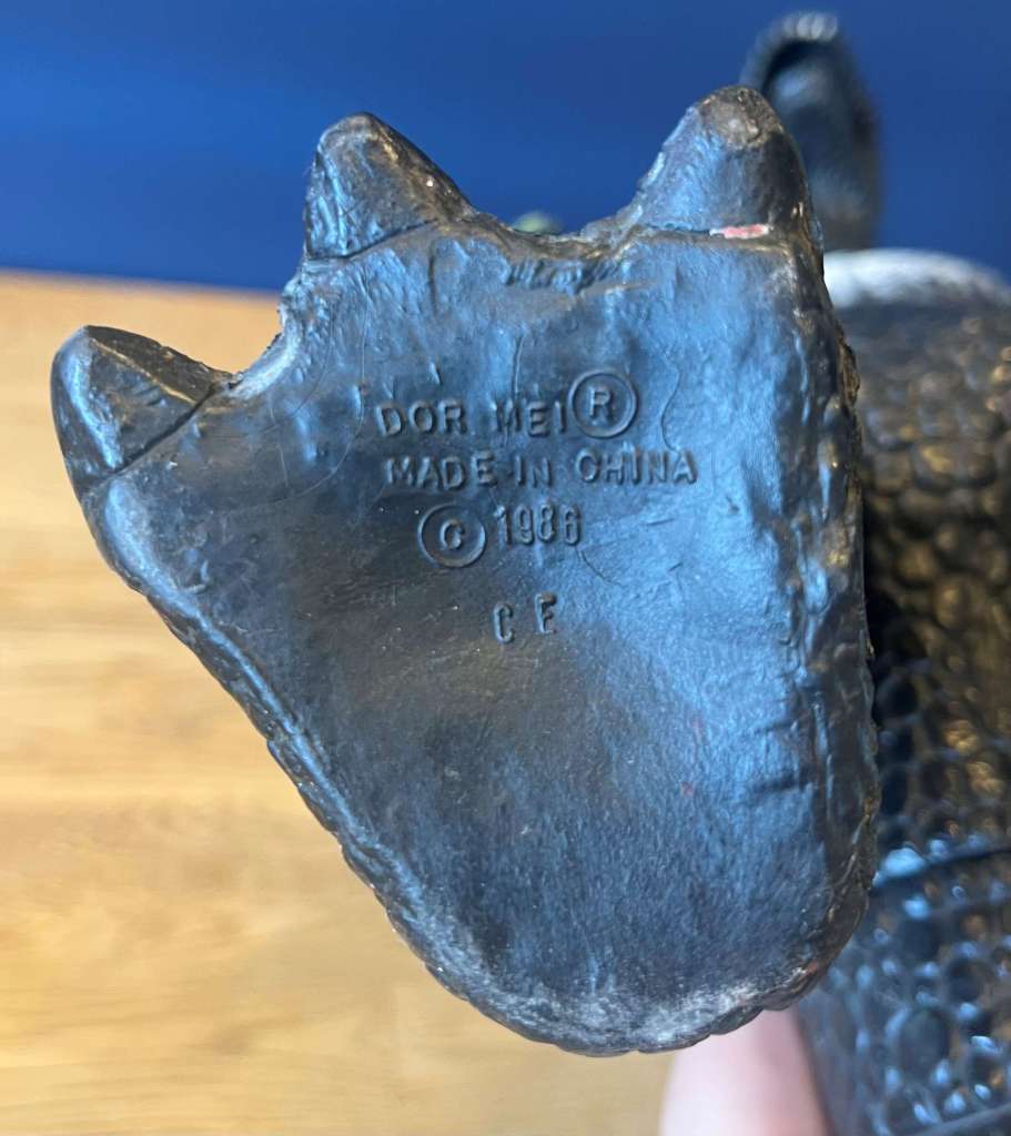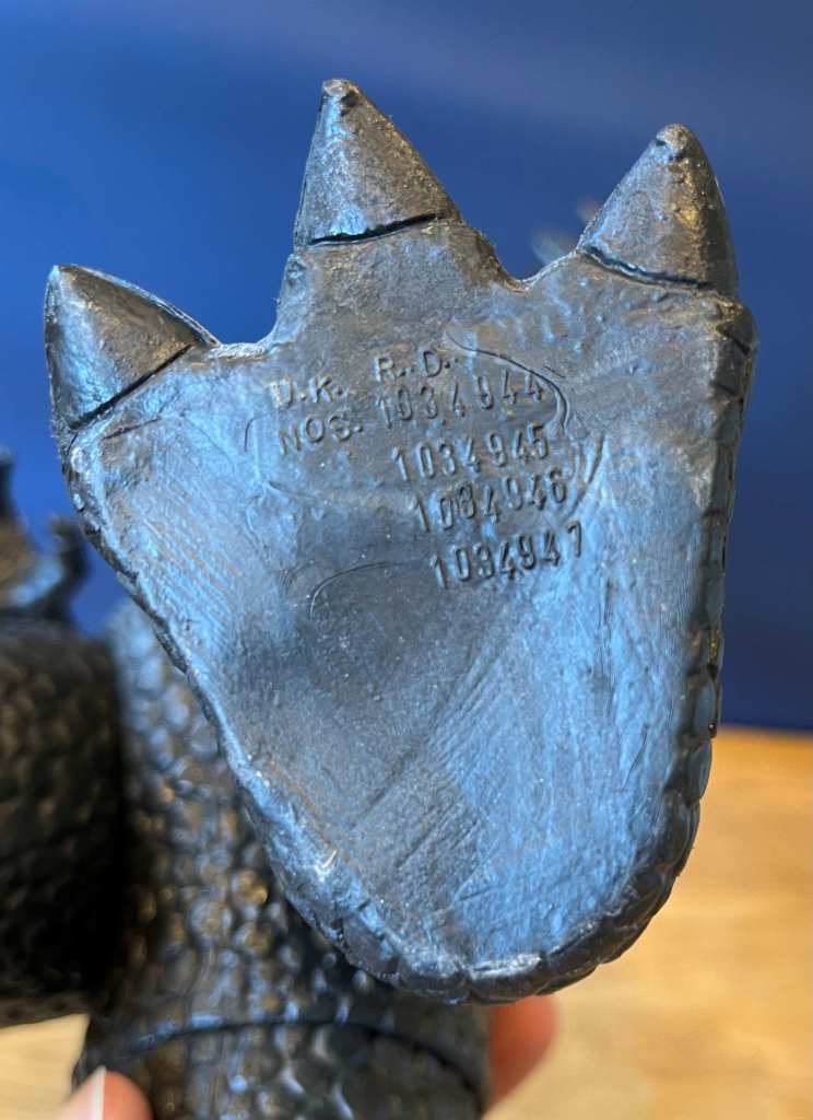 These are strange beasts. They are enormously rare, known to me only in five examples, of which I own two. One of mine (the black and purple one) clearly has “MADE IN CHINA” on the sole of its right foot. Normally I would not doubt the country of origin when confronted with such a blatant statement, but nothing else here agrees with a Chinese origin. The facts are: