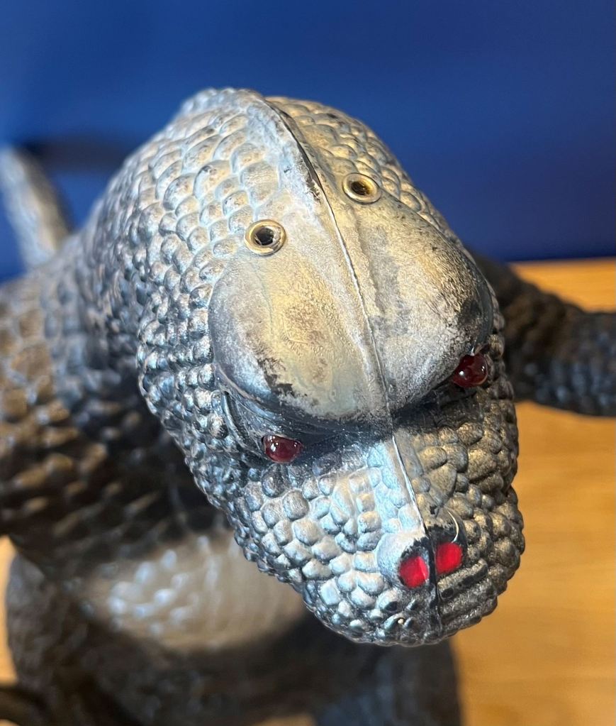 Finally, a late version has two metal circles on top of its head – these being sensors which when touched make the eyes light up while the figure emits a roaring sound. These figures exist for several head-sculpts.