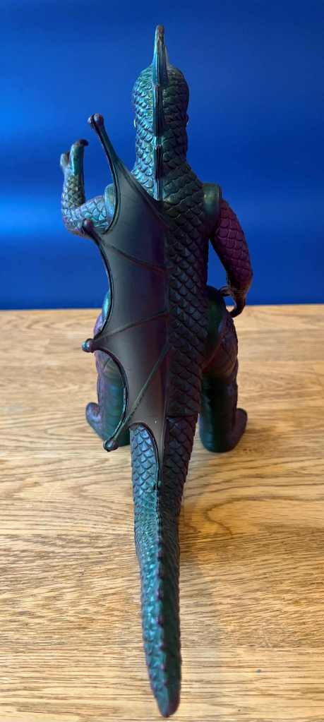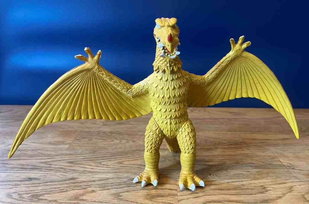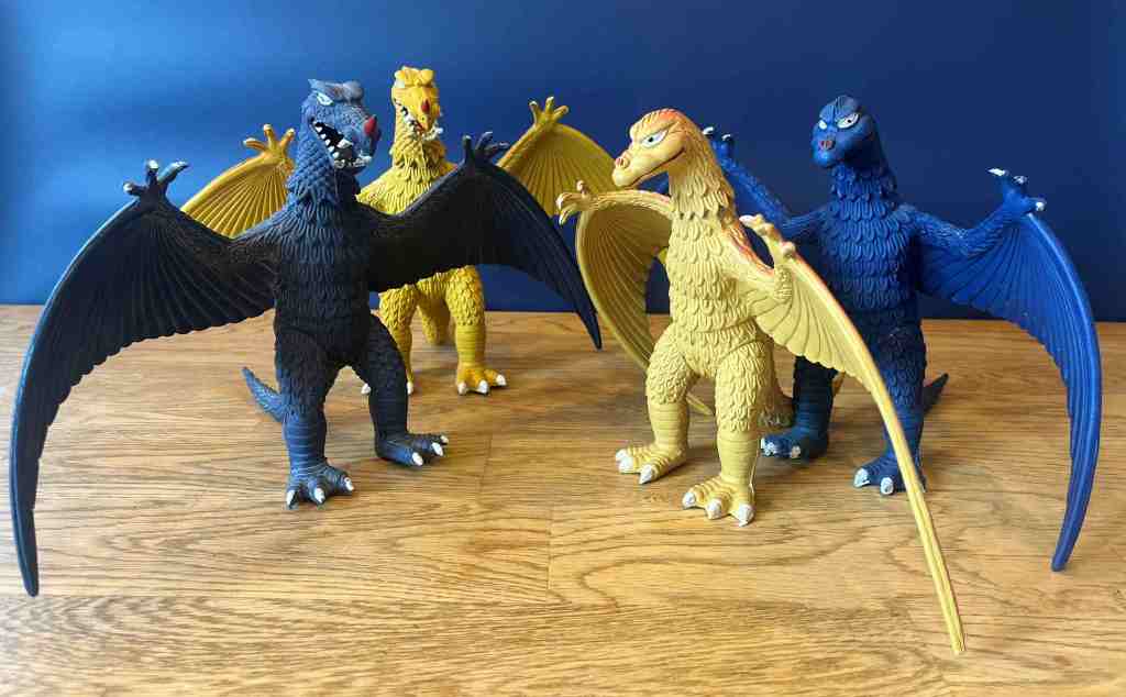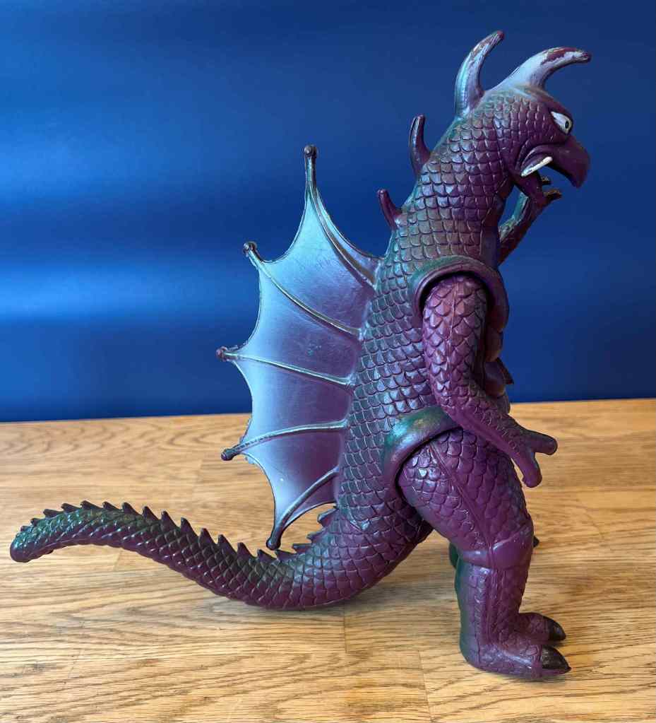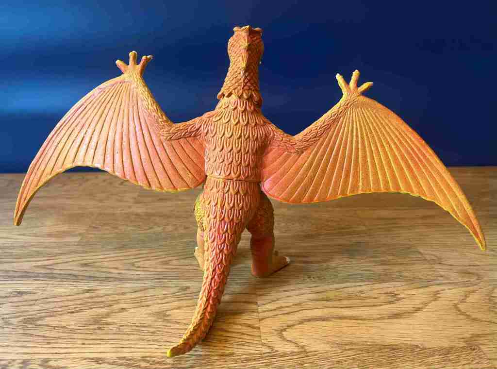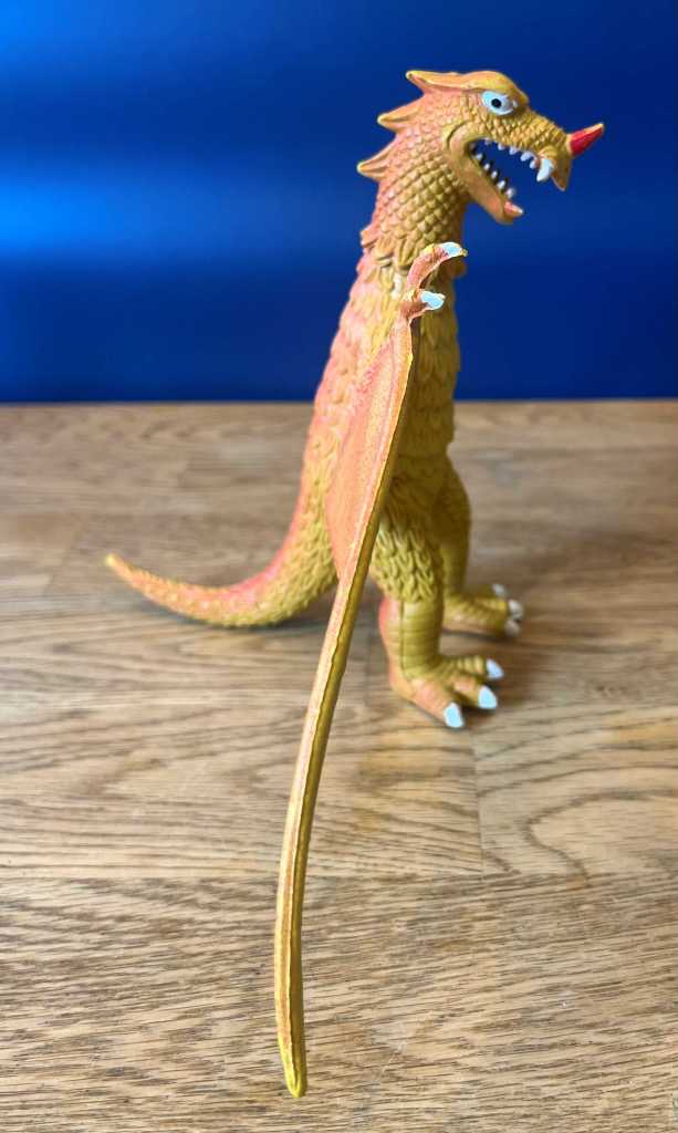 This one was also produced in hard plastic, but is smaller than the others, standing 165mm. tall, and weighing about 127g. It has wings instead of arms, and these do not articulate, and has a solid tail that does not articulate either. Instead, it has articulated legs, and a mid section and head that can revolve in a horizontal plane. It has three toes, and a scale pattern of elongated shapes marked with internal grooves to resemble feathers. The throat is closed. These come in blue or yellow colour variants, with head variants with or without open snarling or closed mouths, prominent fangs, side-facing or partly front-facing eyes, backward facing head spines and head shapes that resemble some forms of Godzilla or just perhaps the monster from ‘The Giant Claw’ (1957).