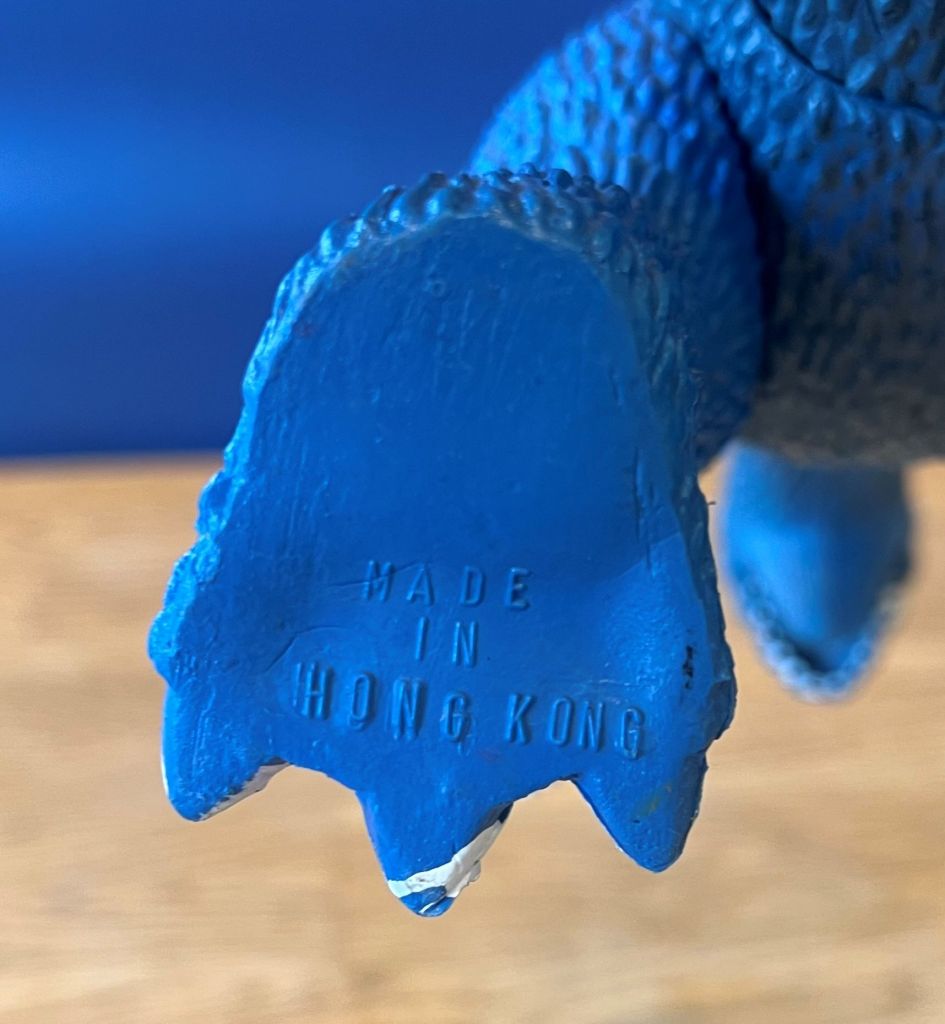 In addition, I know of a few examples with this expanded to a “MADE / IN / CHINA”, and even fewer with “MADE / IN /HONG KONG” under its foot instead, which look very much like the marks of the Hong Kong-made Godzilla bootlegs noted immediately above.