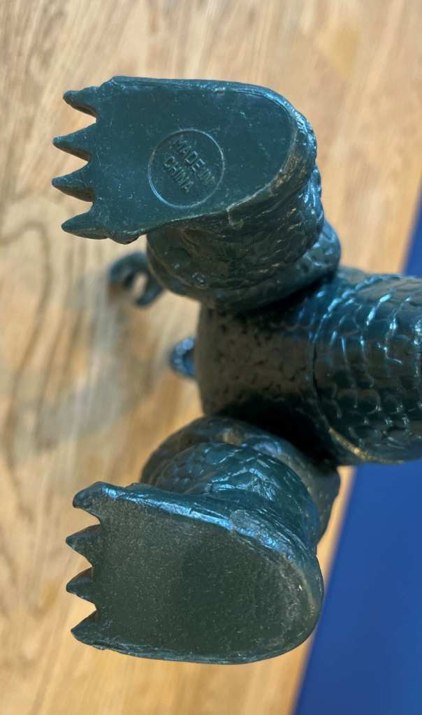 Like the ‘second spotty finned Godzilla’ both examples known to me have the distinctive “MADE IN CHINA” marks within a circle on the sole of the right foot, and the same faint and half erased “MADE IN CHINA” positioned so that the text sits underneath the toes, with its top towards the inner part of the foot, and its bottom towards the toeline – exactly like my own example of ‘second spotty finned Godzilla’ discussed above. They were, most probably, produced side-by-side with the ‘second spotty finned Godzilla’, as an attempt to enter the lucrative market for more realistic dinosaur toys dominated in China by Imperial, Dor Mei, AAA and others.