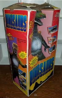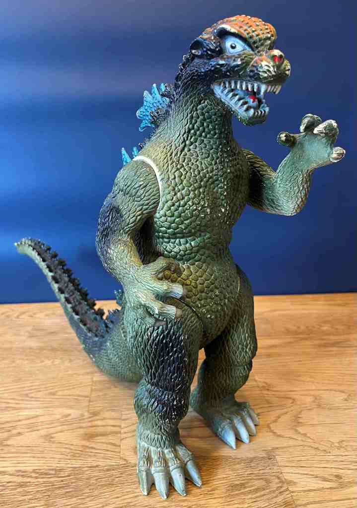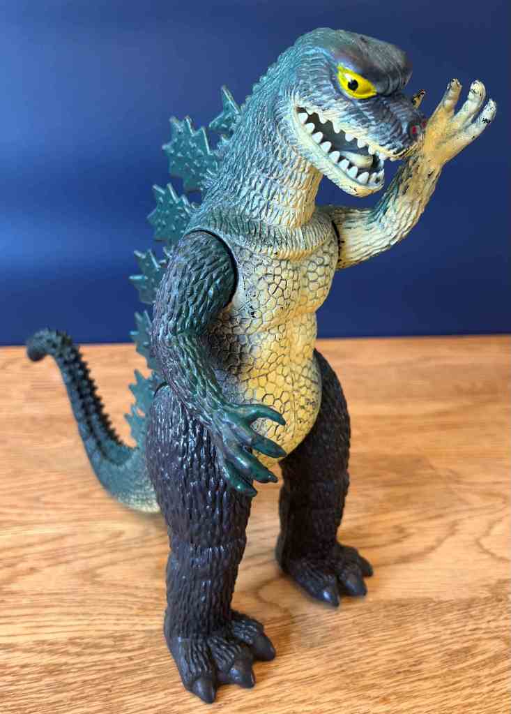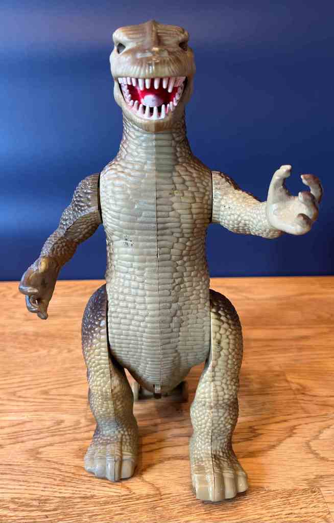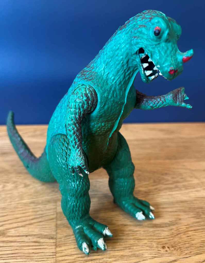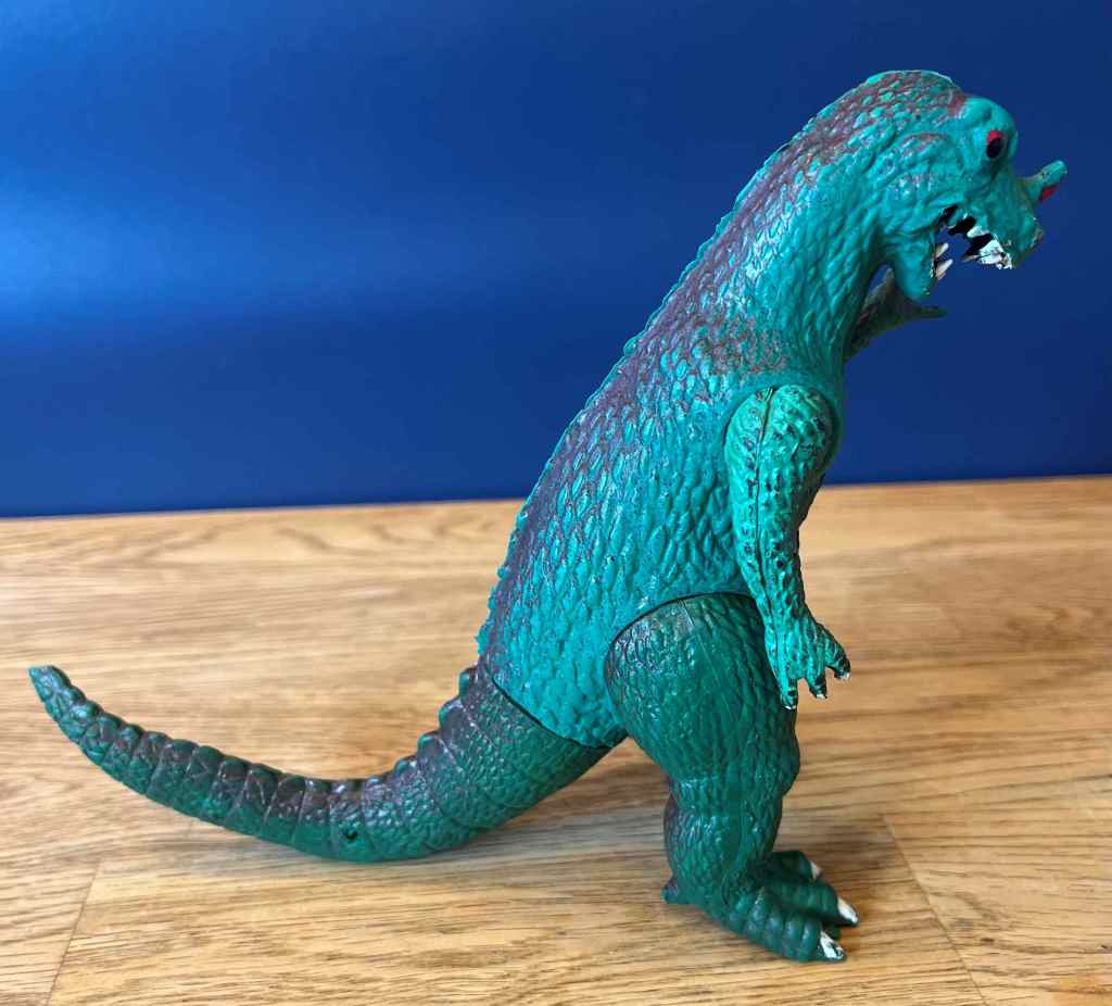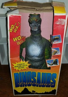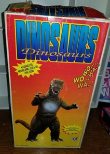 Pictures of one of these roaring Godzillas still in its original packaging for a toyline named “DINOSAURS Dinosaurs” (the first word shouted, and the second whispered?), and with a copyright mark dated 1991, survive on a single eBay listing (but already sold by the time I spotted it: there is a Worthpoint record here). This is of value as a record of the so-often lost packaging, as well as for the comedy value for the interpretation of Godzilla’s roar as a repeated “WO … WA …! WO … WA …!” – they do not make any such noise, but instead make a kaiju-like roar or screech.