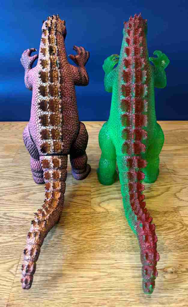 They are made in thin rubber that bends easily when squeezed, and stand 240mm. tall, and weigh about 350g. They have articulated legs and at a single point at the base of the tail. They also have an articulated head, but the arms are fixed in the raised ‘don’t shoot’ position. They seem to have been predominantly black with green shading and silver spine-fins. Some have orange shading with silver spine-fins and others (as with one of mine) have pink-purple shading with gold spine-fins – however, close inspection of mine reveals that a base-coat green shows through on the spine-fins and so it must have originally have been shaded in that colour, before some of these bootlegs were over-painted in the other two colour schemes. Another one, in my collection, has a quite different colour scheme – and was produced in translucent bright green, with solidly black eyes and the edges of its spine-fins coloured orange-brown. It is identical in its features to the others, and clearly from the same molds, but was made in very different rubber. This one has no “Made in China” marks under its feet.