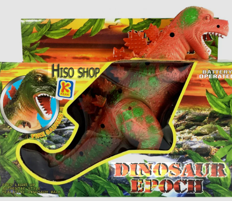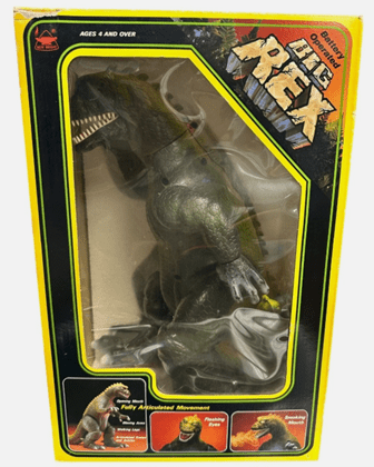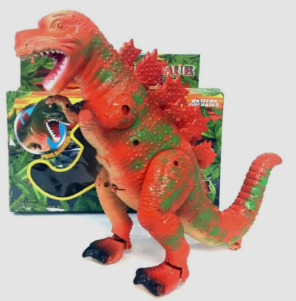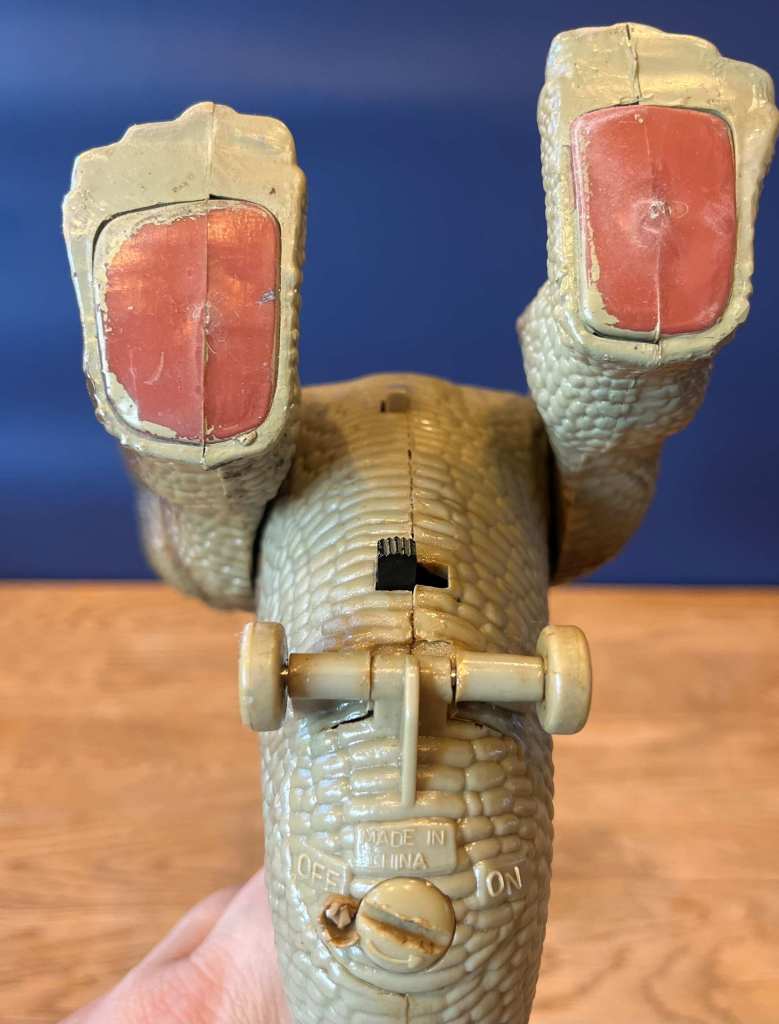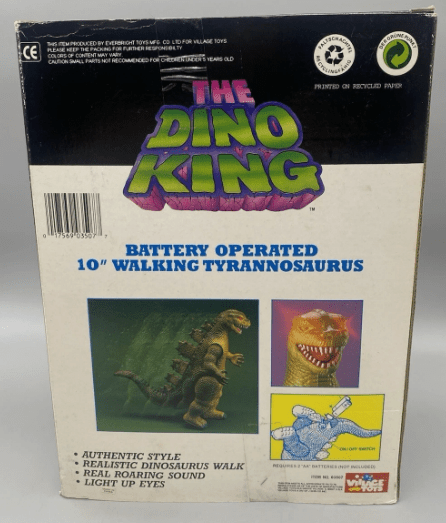 Here I do own an example, and can give a fuller report of its details. It was produced in hard plastic in green with paler shading on its underside, stands 260mm. tall (approximately 10 and 1/4 inches), and weighs about 100g without any batteries. The face sculpt most closely resembles the later Imperial mini (angle of head, open mouth and nostrils at upper edge of muzzle), but with a bulging tongue. The spine fins are soft orange rubber and most close to those found in the earlier Imperial models. The tail has been lifted up to be closer to the body, and the body is supported by a wheel at the base of the tail, while rubber grip pads under each foot allow the beast to drag itself forward when walking. A battery compartment sits inside the base of the tail, and when activated by a switch or a button in the same place, the creature roars (through a speaker mounted in the right hand side of its torso and visible through a series of small hoels in rows there), its eyes flash with light and it walks forward, moving it legs and arms as it does so. The only marks on the model itself are a tiny “MADE IN / CHINA” on the battery case cover. However, these are common, and thankfully original packaging survives for many examples: