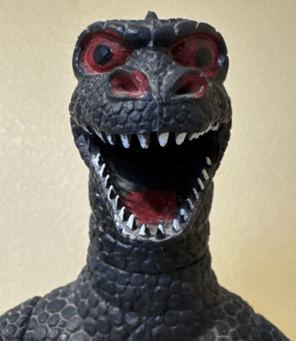 The figure is reportedly 230mm. tall and clearly reused the main form of the body, arms, legs and tail produced for its siblings: the ‘chonky leg Godzilla’ and the ‘second spotty finned Godzilla’. The spine fins on the main body have been done away with, and a more realistic T-rex-like head has been added, with enlarged eyes painted bright blue. The same bulging tongue is present as with its siblings, and its most prominent feature is a notable overbite that makes me think of this dog.