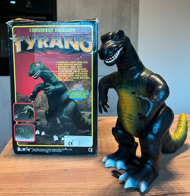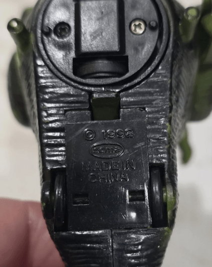 These show that it was produced in China by Everbright Toys MFG Co. ltd. (a Hong Kong toymaker), for Village Toys (a US company mostly known for importing and rebranding Japanese robot toys in the 1980s). Online sale listings and some brief appearances on Facebook and Instagram (these in Italian and by a single poster) offer the date 1980, but that would be extremely early (and impossibly predating the Imperial model it copies) and as there is nothing known to us to support this, it may well be nothing more than a guess. A blog notes two versions, one in light green, one in dark, and two versions of the packaging giving it the toyline-name ‘Dino King’ or the less common ‘Prehistoric Animals’.