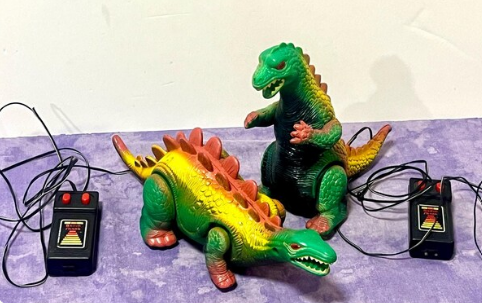 These seem to be a relatively late addition to this club, but their distinctive shaped spine-fins with neat rows of raised bumps along them, as well as the general design of the head, show that, at least in part, they were copies of the later version of the Imperial mini, or one of its bootlegs. In addition, they owe much to numerous other T-Rex toys of their era. They were likely mass produced in China for some time, and repackaged and remarketed again and again, and exist in two main versions: one with a fixed open mouth, and the other with a moveable jaw:
