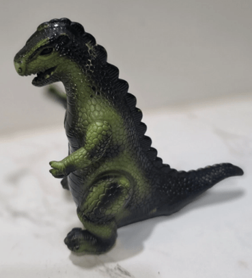 Bizarrely, Soma Toys also produced at the same time as the ones detailed immediately above, another quite different bootleg drawing on the ‘company X’ model. The muzzle design, detailed scale-pattern, row of sawtooth spine fins and three toes that end together in a single line strongly suggest an origin for the design of this figure in the ‘company X’ model. They articulate in the same way as the ‘company X’ models, as well as at the neck. They are in hard vinyl, stand about 155mm. tall (just over 6 inches), and weigh about 29g. They appear in black with green or burgundy-red highlights, and have a further crystalline layer of paint added to their heads, edges of fins or spikes, hands and feet and in a crude ‘V’ shape on their chests. This crystalline paint I discovered by accident while walking through a dark corridor holding mine, glows in the dark. They have a head with notably high skull-top and brow-ridge, and uniquely have rows of smaller sawtooth fins along the outer seam edges of the legs. The throat is closed, and they have “© 1987 SOMA” underneath both of their feet. As with other models above this date should be seen as the beginning of their production run, not a definitive year that all examples were produced in. These models have one notable feature of their own – a design flaw in the legs, that produces a ‘bow-legged’ stance that along with the fact that these legs are set at the back of their lower body makes them extremely unstable, and inclined to lean precariously forward. In this regard the legs are almost as badly spaced and sited as the Yamakatsu 2.5” Godzilla figure or some of the dreaded silently-screaming chinasaurs.