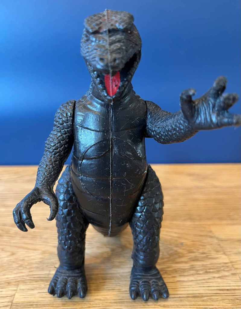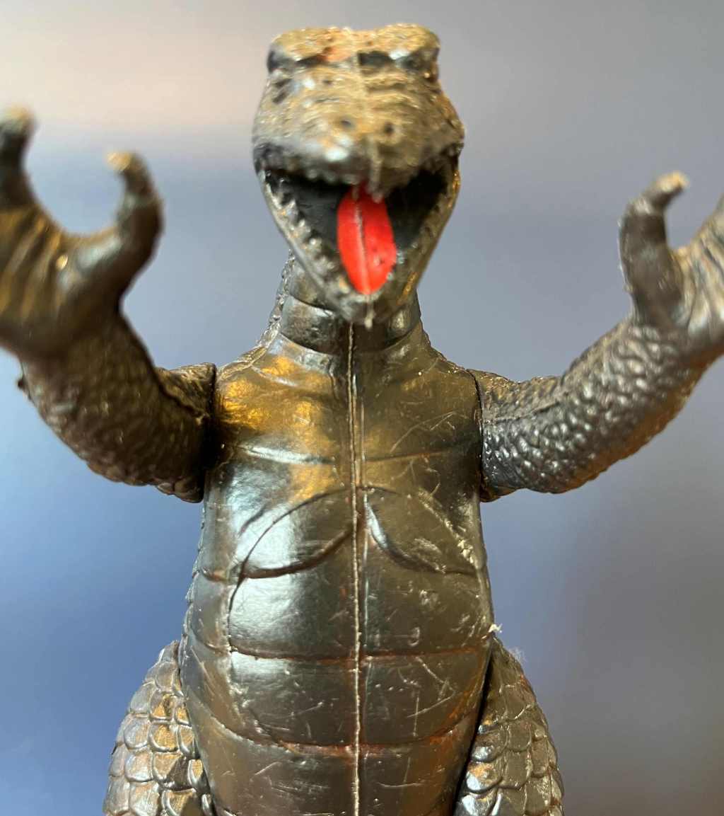 The immediate model is that of a Chinese bootleg Godzilla, made in hard rubber as hollow figures, and only slightly taller at 155mm. tall, weigh about 127g., and have a throat closed at the top of the larynx, leaving the whole head empty. I know of them in yellow with orange and green highlights and black with dark green highlights. Somewhat oddly, many of them have convex soles to their feet, as if their legs were molded in a process that generated an internal air pressure higher than the surrounding atmosphere. These have “CHINA” marks under their right feet, often faintly. They articulate exactly like the Serbian bootlegs. The two are, in fact, so close that virtually every scale and fold of the bodies is identical, and we must presume that the Serbian one was cast from a Chinese one through some process which slightly reduced the size of the offspring.