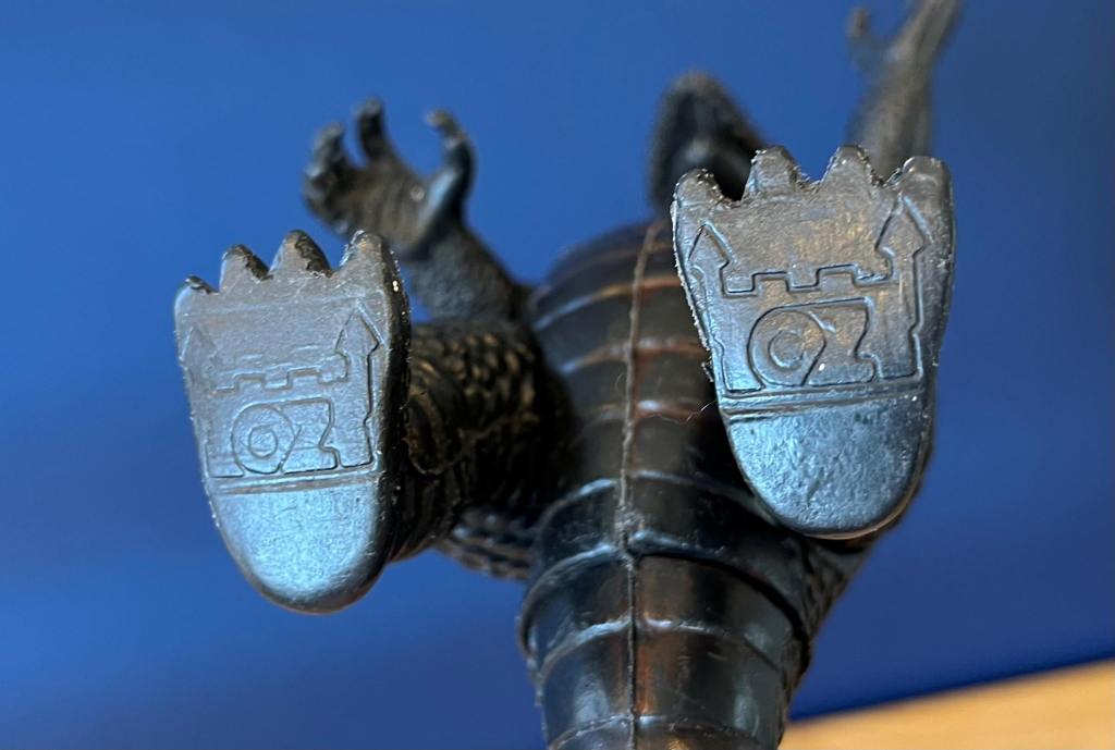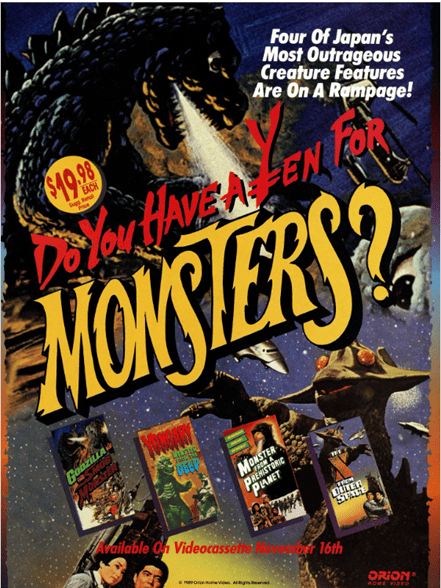 There are no marks on the feet of the Godzilla-clock, but its origins are well known. It was produced for an Orion Home Video Japanese and Korean monster films promotion in the United States in the late 1980s. Orion expanded into home video distribution with the formation of Orion Home Entertainment Corporation in 1985, and was distributing videos under the Orion Home Video label from 1987. Luckily a copy of a magazine advert for this monster film promotion, dated 1989 at its foot, has been reposted on Instagram, giving us the most likely date (16 November 1989) of the initial giving away of these Godzilla-clocks in the United States: