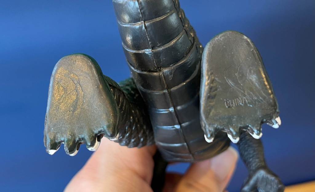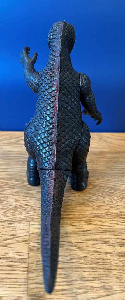 There are elements here that point towards the Imperial Chinese model (such as the four toes that end together in a single line: see my Chinese bootleg Godzilla post), or the Chinese ‘company X’ model (such as the saw-toothed spine fins: see Chinese bootleg Godzilla post). However, neither of those is the actual model, and the key to identifying what is lies in that large flattened circular spot on the chest of the beast.
